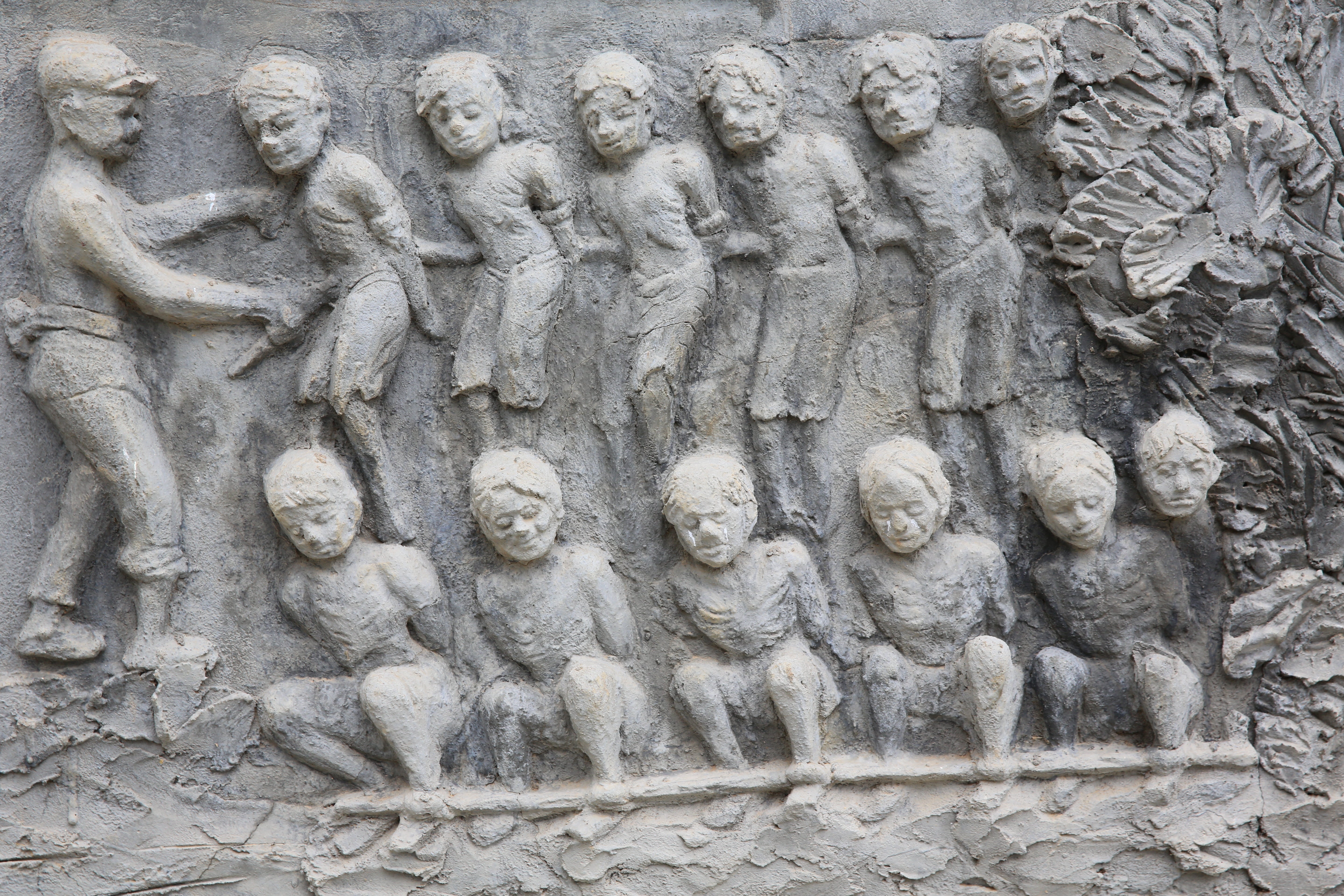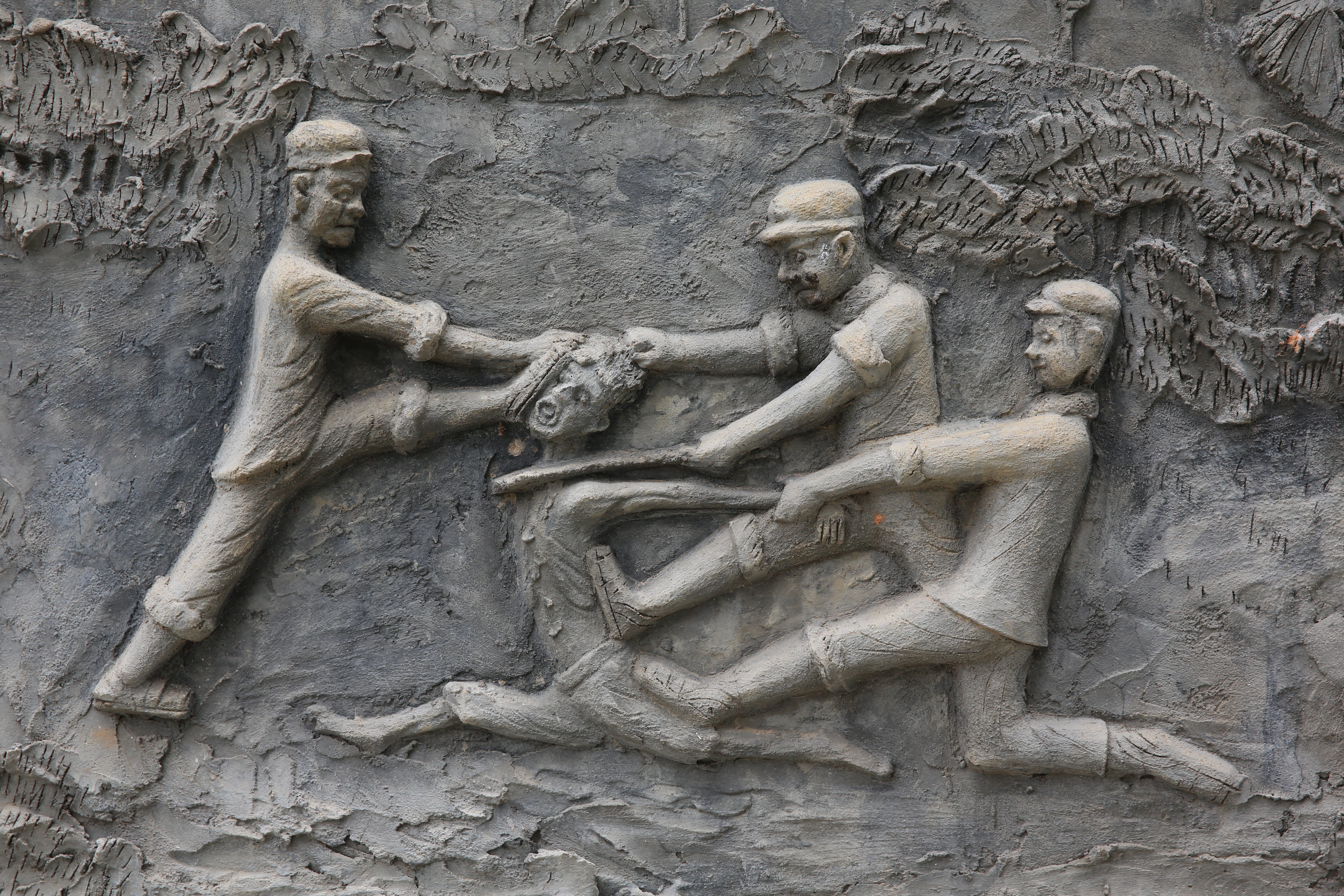 Memorial shrine festooned with bas-reliefs of Khmer Rouge atrocities